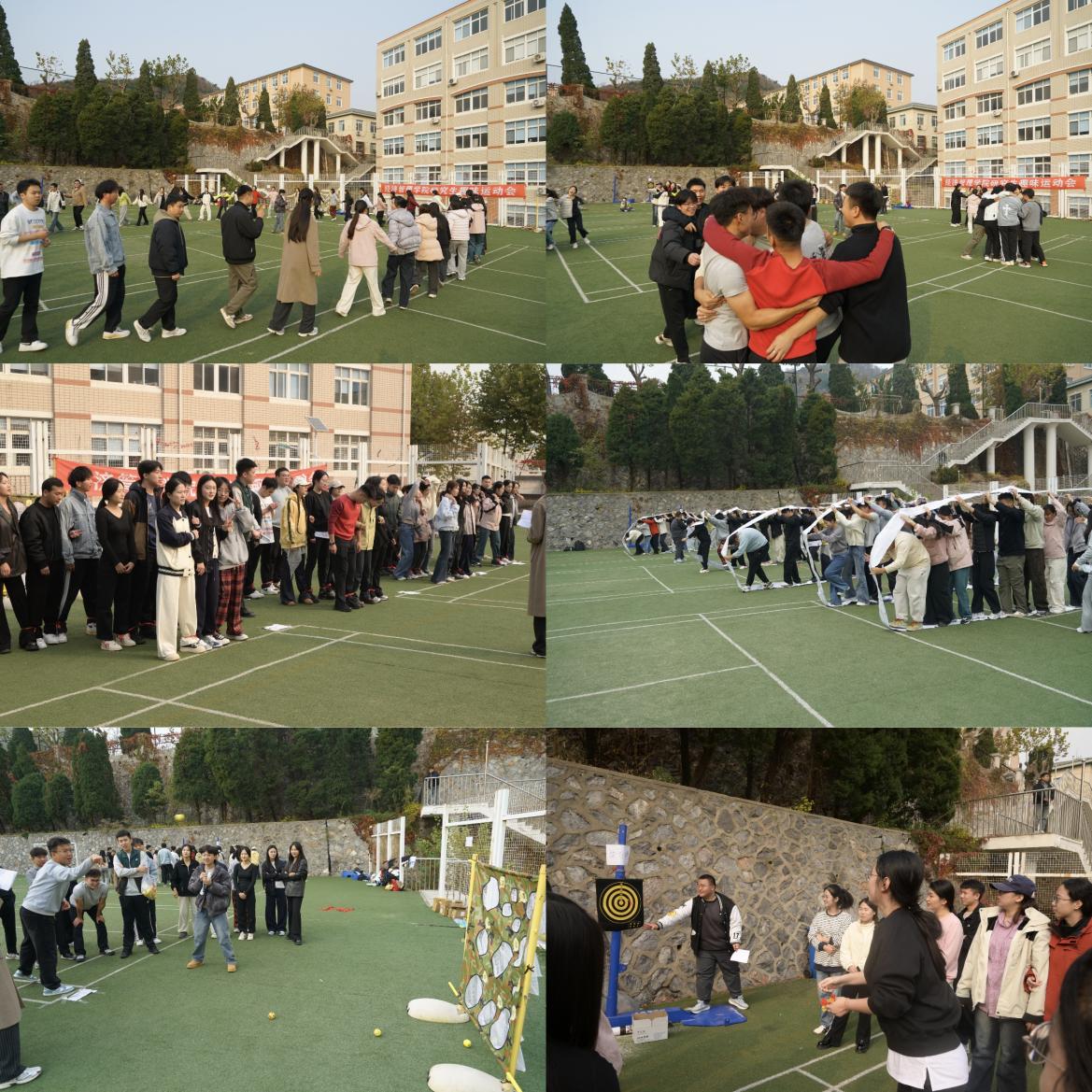 “听数字抱一抱”率先点燃了现场氛围,同学们围成一圈,根据听到的数字迅速寻找伙伴并相拥在一起;随后的五人四足接力赛考验团队默契,参赛队员绑紧脚踝,喊着“一二一”的号子同步前行;纸环冲刺赛中,各队自制的纸环承载着队员们的创意与期待,大家推着纸环稳步前行,既要控制速度又要防止纸环破损;投球与投飞镖两个项目则展现了同学们各自的精准技巧,他们凝神瞄准、果断出手,每一次命中都引来围观同学的阵阵喝彩。